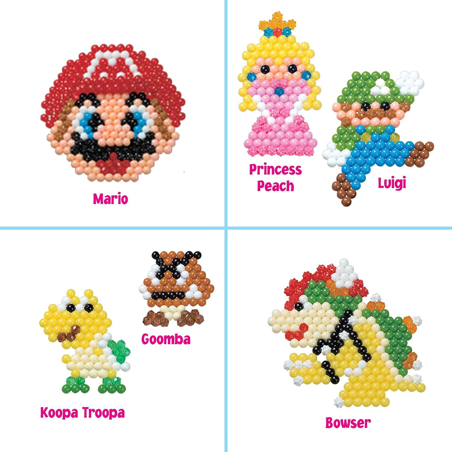 Make creations of your favorite Super Mario characters, such as Mario, Luigi, Princess Peach, Bowser, Yoshi, Bob-omb, Goomba, Koopa Troopa, Koopa Paratroopa, and Piranha Plant.