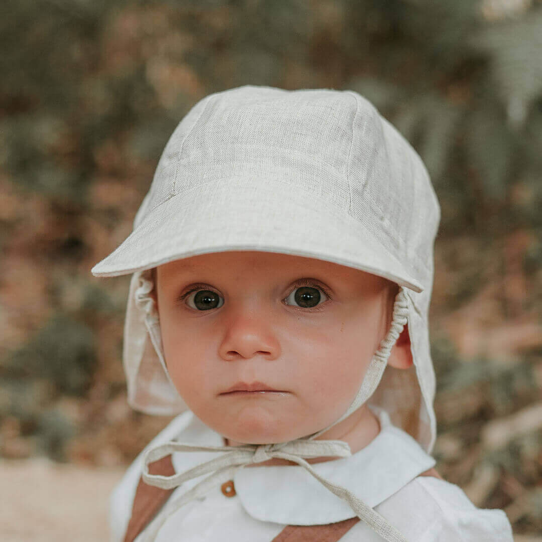 Bedhead Heritage Lounger Baby Flap Hats are light on heads, making them the ideal first hat for babies as they forget they're wearing them! The soft flap lies flat behind baby's neck while they're in a pram or baby carrier, and the brim is slightly upright letting them see the world. Made from 100% eco-friendly linen which can self-cool in summer and warm in winter, the Lounger hat provides UPF50+ sun protection without overheating little heads.