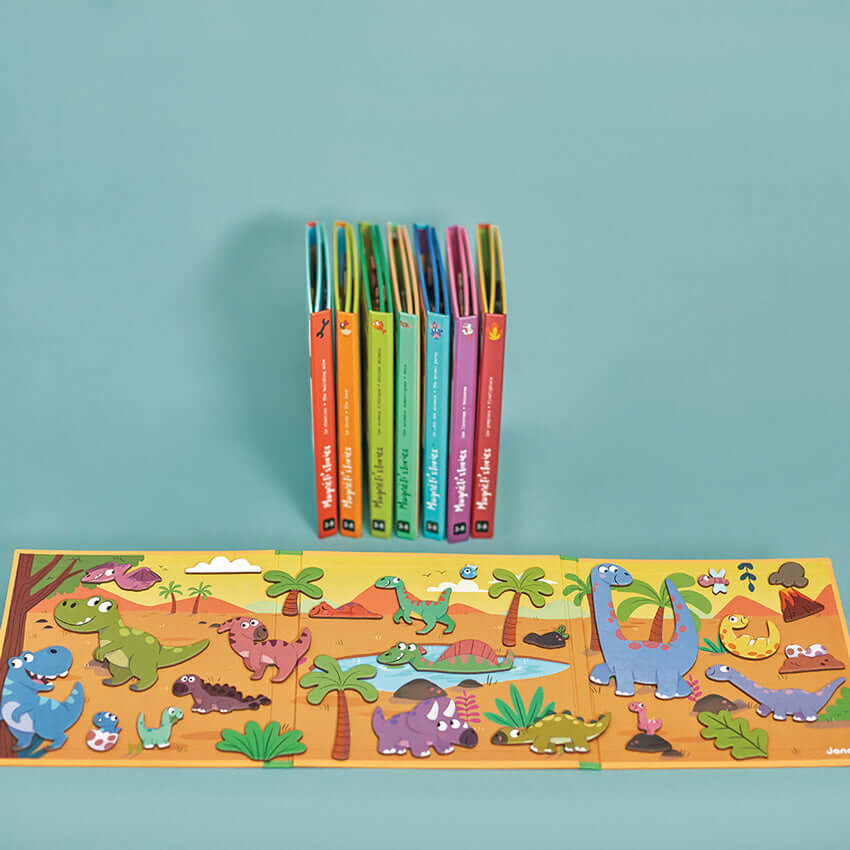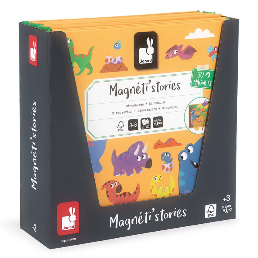 Delve into the world where Jurassic animals are within easy reach! With this adorable portable magnetic story, your child will be transported back in time to a distant dinosaur populated era, where imaginations roam free as they invent their own countless stories. Open the magnetic board to find a large colourful magnetic backdrop and 30 dinosaur themed magnets, perfect for enhancing any story! This open ended toy is great for stimulating imagination and fine motor skills, and measuring 18cm x 18cm once folded, it can be taken tucked away in a bag and taken anywhere! Made from FSC certified cardboard and just one of the Magnetic Stories available in the large collection.