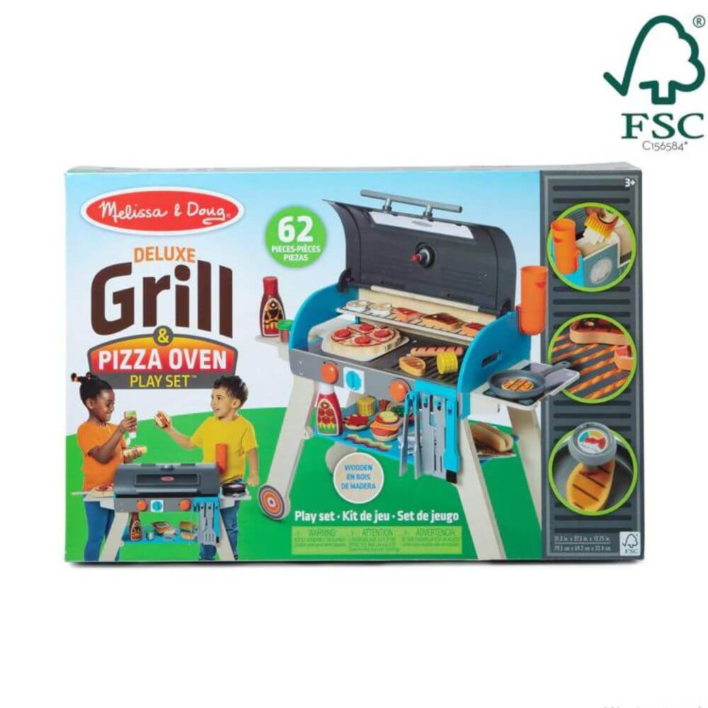 Fire up pretend play with this perfectly kid-sized wooden barbecue grill, smoker, and pizza oven play set! Pour pretend wood chips into the smoker box in the back of this lift-top grill. Budding young chefs three and older will love creating make-believe barbecue favorites like steak, chicken, burgers, hot dogs, corn -- and even play pizza! Place wooden play food “uncooked” side up on the grill, griddle, or side burner, set the built-in timer, pretend to baste, then flip with the included utensils to see grill marks! Create a yummy wooden pizza with toppings, then slide it from the pizza paddle onto the grill through the side pizza oven opening. Turn dials to raise and lower “flames,” and press the removable thermometer into holes in the play food to check when food is “done.” After mealtime, the more than 60 accessories and play food pieces all store neatly on the grill and storage shelf for easy clean-up. The Deluxe Grill & Pizza Oven Play Set promotes hand-eye coordination, sorting and counting skills, and imaginative play. This product is certified by the Forest Stewardship Council. FSC certification ensures that products come from responsibly managed forests that provide environmental, social, and economic benefits, and that forests are protected for future generations. Please note that FSC certification applies to new inventory only (FSC C156584)