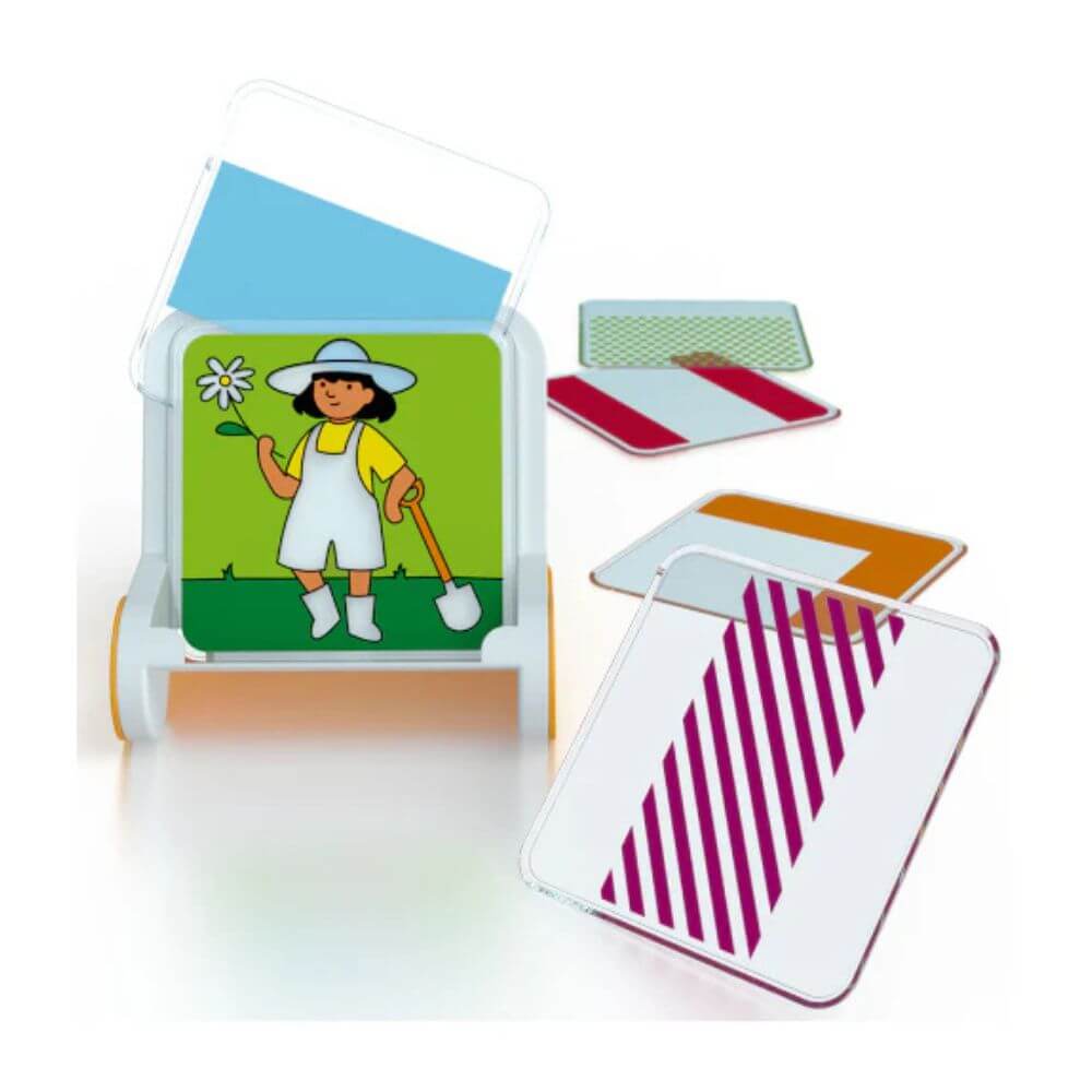 Inside the Box: 1 game holder/storage case, 8 tiles with coloured patterns, 4 tiles with figurines, booklet with 80 challenges and solutions