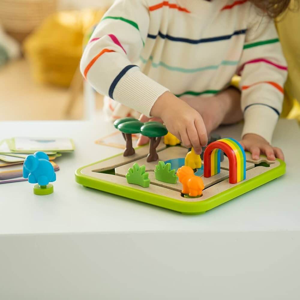 3, 2, 1 and pose! These safari animals love to model for your camera! Can you get the animals in the picture-perfect position for the snapshot? Don’t forget the lion doesn’t like water, the elephant can’t climb over the rocks and the giraffes are too tall to fit underneath the trees. A 2-in-1 learning game for toddlers: puzzle or play and let your imagination go wild! Learn about shapes and concepts as left, right, on top, in front, and behind. Sort shapes and follow the path. Ready to have a wild time?