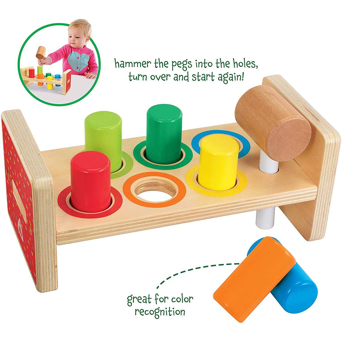 Carefully crafted from wood for a classic-toy look, it features six colourful pegs in a cylindrical shape, one light and easy-to-hold hammer and, of course, a six-holed bench. Hammer the pegs into the holes, turn over and start again. Let's bang the brightly coloured pegs into the holes. Start of swinging the hammer slowly and go faster as your confidence grows. Lets call out colours as we hammer in the pegs. How many pegs can you count?