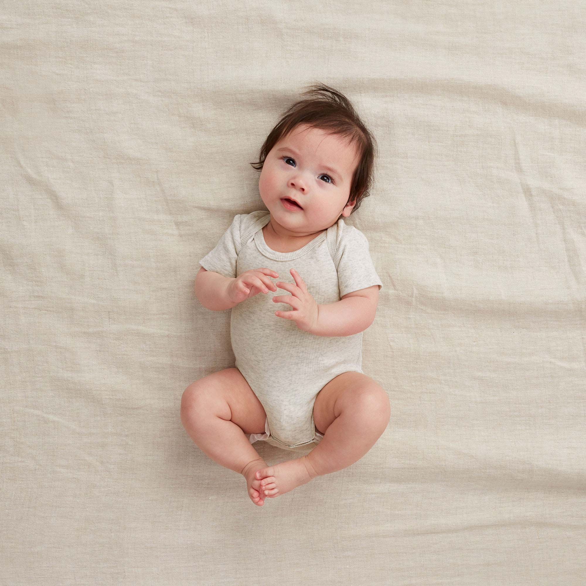 Made in Australia.The Bodywear Collection is a range of gorgeously soft, ribbed organic cotton basics for your mini to dream away the night and play during the day in comfort. The Short Sleeve Bodysuit features a slim-fit and stretchy design with short sleeves, making it a comfortable and light layer to wear under any of our Pouches or Layers. Dressing your wriggly worm is made easier with envelope shoulders and press studs at the crotch. The GOTS-certified ribbed organic cotton is breathable to help regulate body temperature, non-toxic, and oh-so-gentle against your child's sensitive skin. We guarantee you'll love the Long Sleeve Bodysuit so much, you'll want extra for daywear too! Our new Bodywear range is designed and made in Melbourne, Australia.