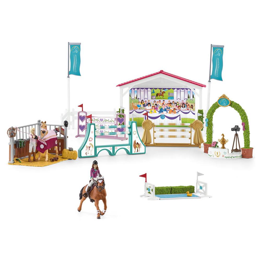 Sofia and Lisa ride an Arabian and a Trakehner mare at the Schleich® Horse Club friendship tournament. The diverse play functions and the extensive accessories ensure great fun.