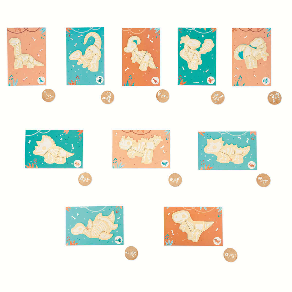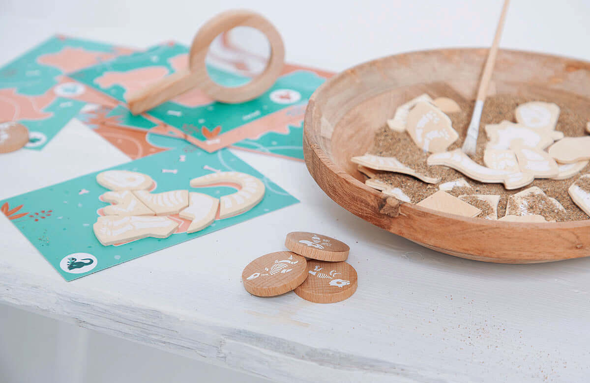 Who does this bone belong to? Your child becomes a real palaeontologist with this Janod Dino Dig game. The object of the game is to reconstruct the different dinosaur skeletons by reassigning their bones. What better way to be fully equipped than with a magnifying glass and a brush? This set also includes 10 dinosaur cards, 64 wooden bones, and 10 wooden clues. To add another dimension to the game just add the included sand to hide the bones. The digging can start and last for hours and is ideal for developing concentration and memory. This Dino Dig Game is made from FSC wood and cardboard and ideal for children 4 and over.