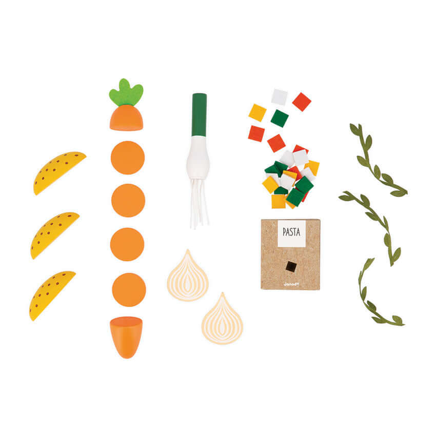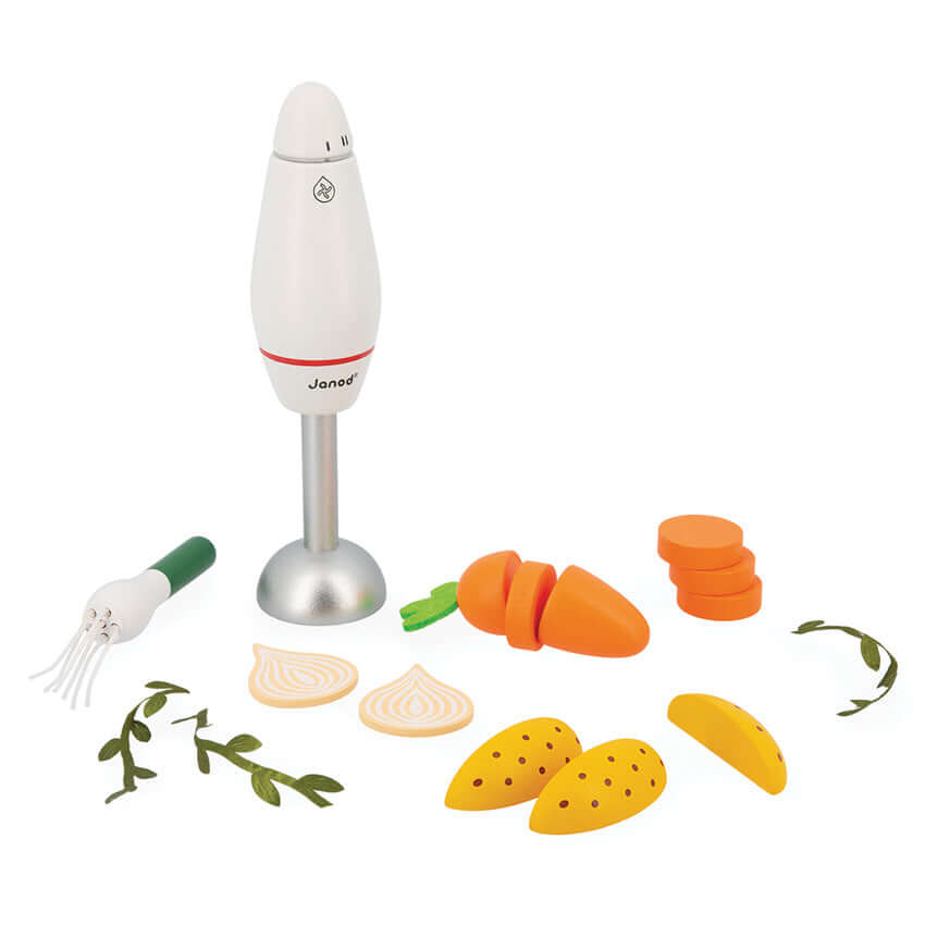 Introduce your child to the wonders of soup with the Janod Soup Set where they can create a variety of soups to suit everyone's tastes whilst learning to cook vegetables. This set consists of 43 pieces: a metal saucepan and ladle, a wooden blender, complete with speed controls for mixing the vegetables, 6 pieces of carrot, 2 onions, 3 pieces of potato and a leek made of wood, 3 sprigs of herbs made of fabric and 24 small pieces of colourful pasta stored in a cardboard box. With its realistic accessories, this food play set will allow your child to invent tasty dishes and recreate the world of grown-ups: create a shared moment around a meal. This role play toy is made from FSC wood and cardboard and ideal for children aged 3 and over.
