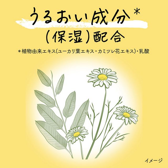 ● Contains moisturizing ingredients* (*plant-derived extracts: eucalyptus leaf extract, chamomile flower extract, and lactic acid)