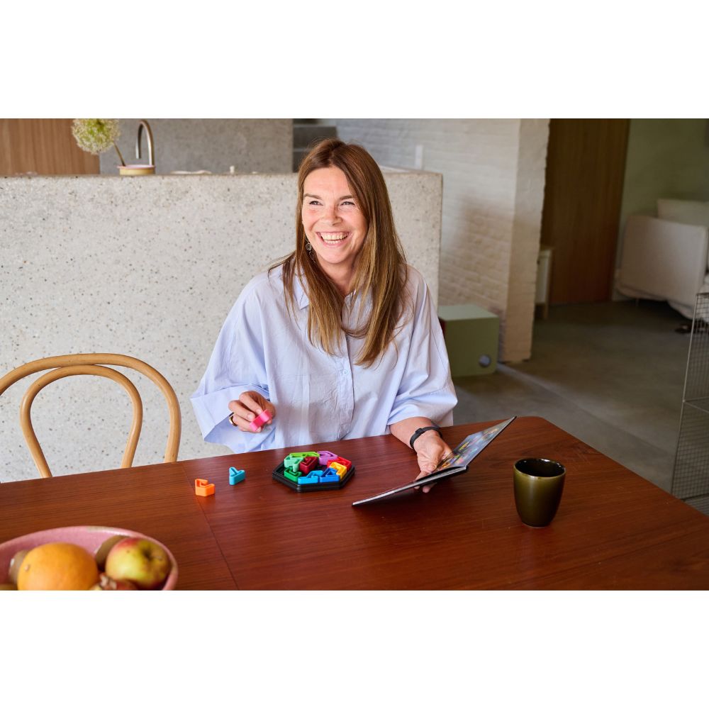 Inside the box: Hexagonal game board with lid, 12 soft-touch puzzle pieces, booklet with 120 challenges and solutions, leaflet with game rules