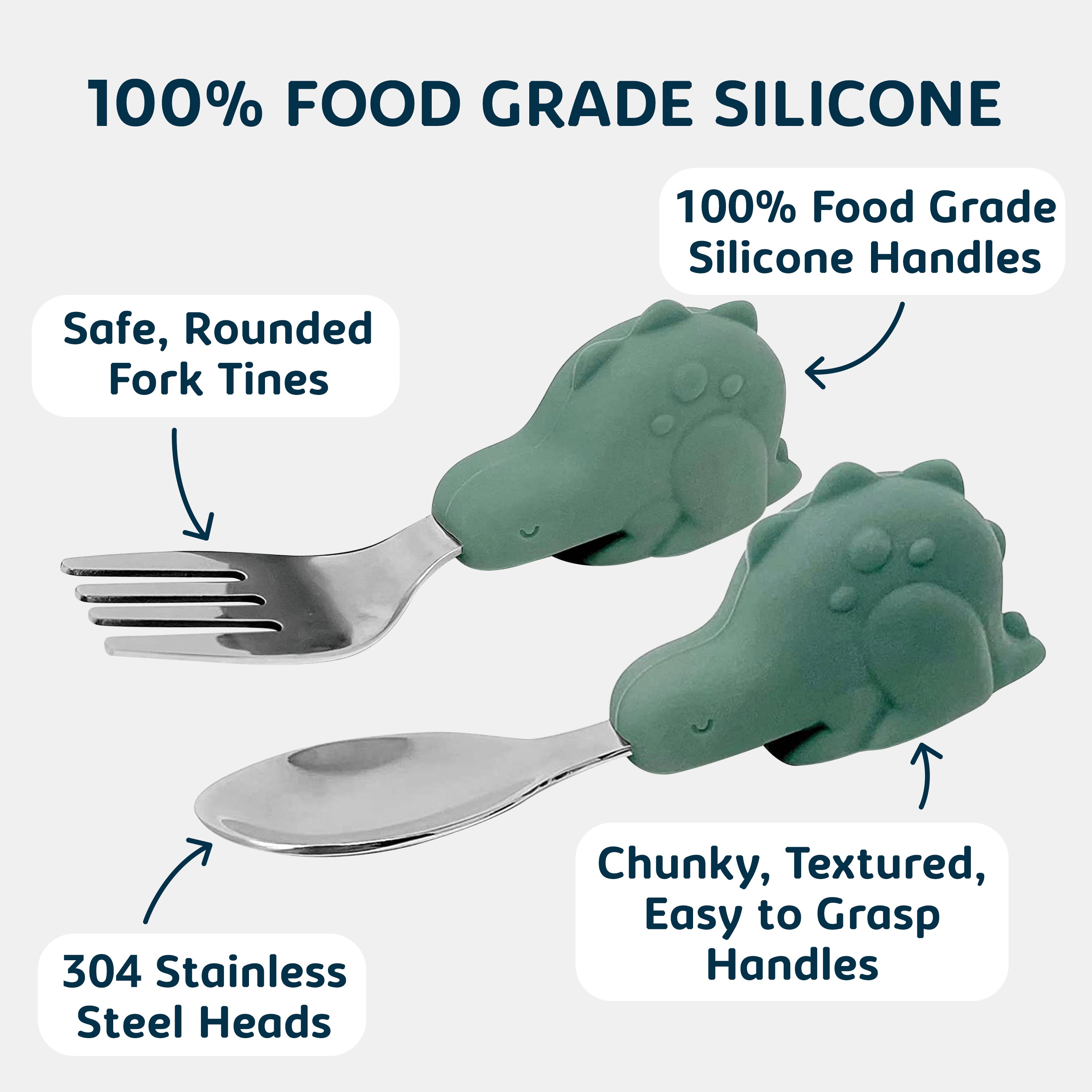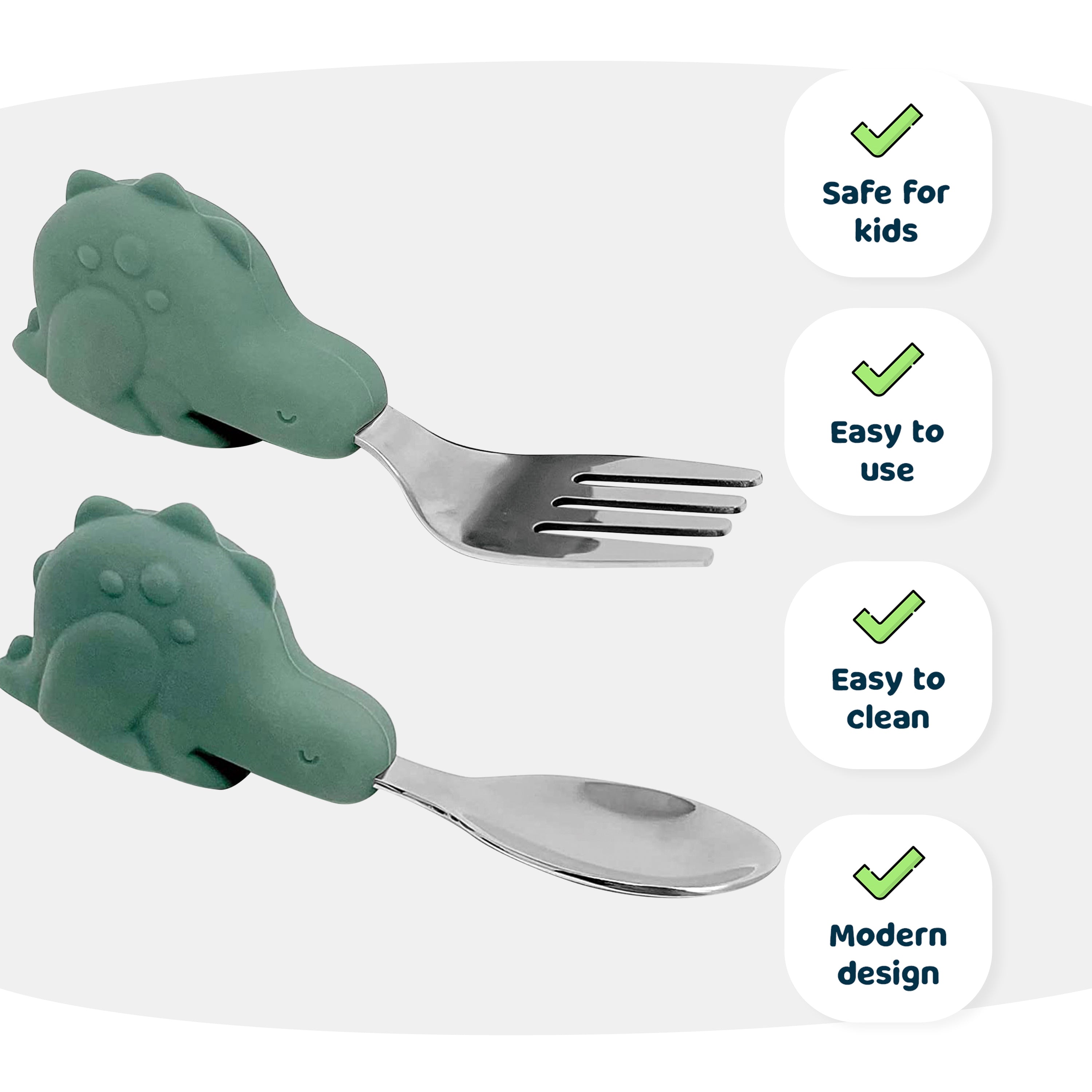 Tiny Twinkle - Silicone Stainless Training Utensils-Olive Dino