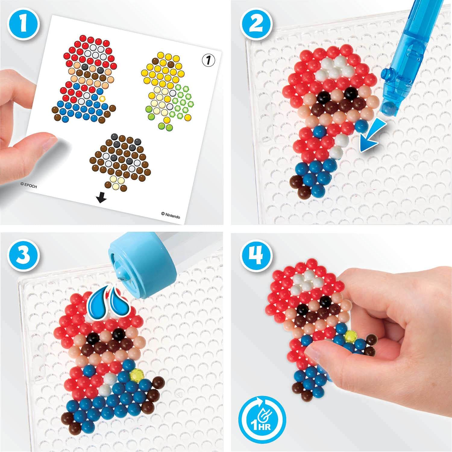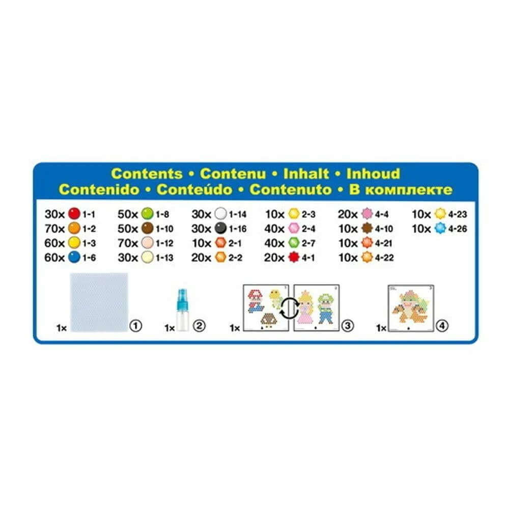 Super Mario Character Set includes over 690 solid, jewel, and star beads in 22 colors, layout tray, sprayer, template sheets, and instructions.