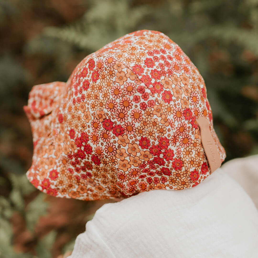 Fully reversible with a pattern on one side and a coordinating solid colour on the other, you get two hats for the price of one. Elasticised chin ties pull the bonnet around a child's face offering protection (and adorableness!) and can be tied under the chin. The elastic in the ties allow stretch and comfort, and ensures ties aren't too tight.