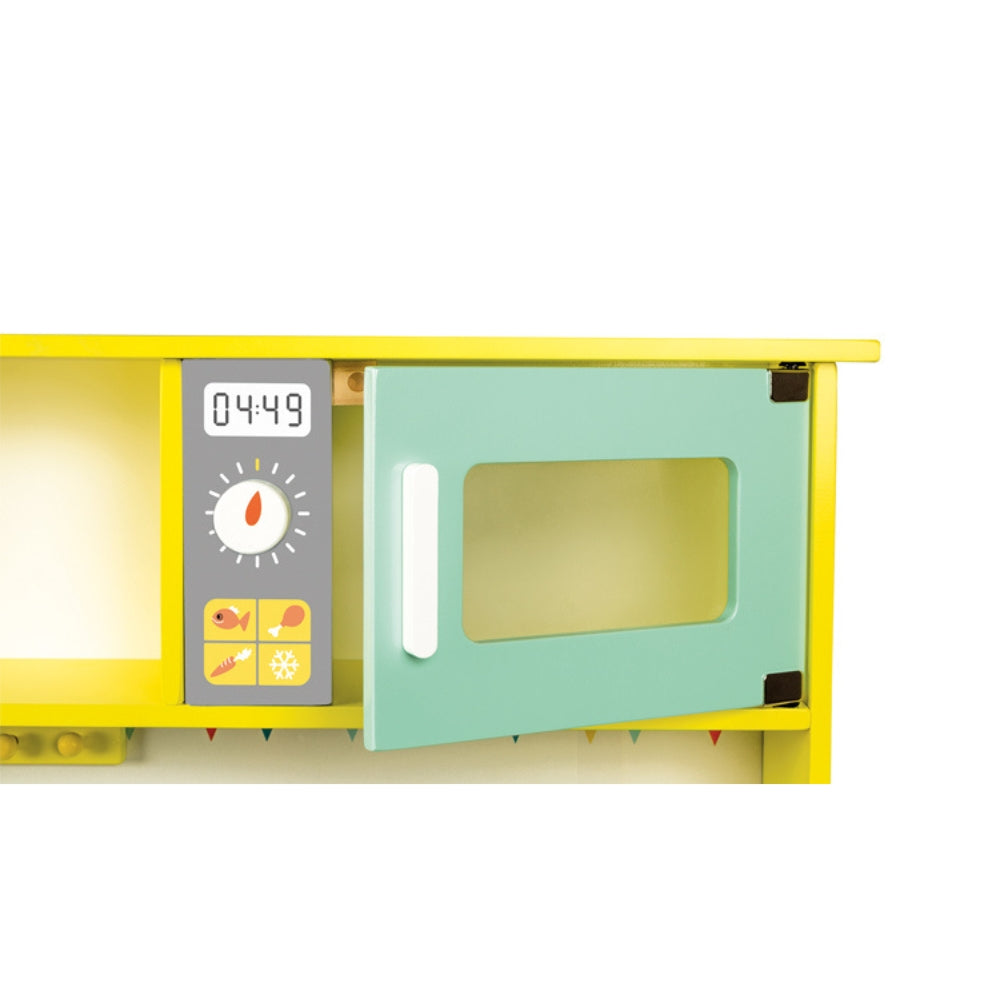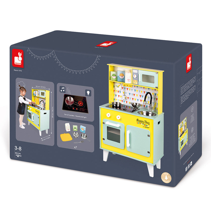 Prepare tasty little dishes for your friends, just like mum and dad! The wooden Happy Day Kitchen includes a clock with movable hands, a peg board for three utensils, two rotating oven knobs that click when you turn them and a metal sink. The sink includes an ultra modern flexible hose tap and the cupboard, microwave and oven doors have magnetic clasps for closing. Just like a real kitchen, the cooktop feature two buttons with light and sound effects to 'turn on' the hotplates and hear the food cooking. Included with the kitchen are 7 accessories comprising a metal spoon, metal frying pan, metal colander, a fabric potholder and 3 cardboard food boxes. 2 x AA batteries are needed for the hotplate effects which are not included.