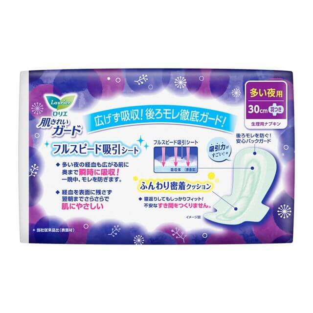 The full-speed suction sheet instantly absorbs menstrual blood deep inside before it spreads, even on heavy nights! Leaves menstrual blood on the surface, keeping skin smooth and gentle until the next morning. Completely prevents back leakage! The soft, close-fitting cushion fits snugly even when you turn over in your sleep! No worrying gaps. (Quasi-drug)