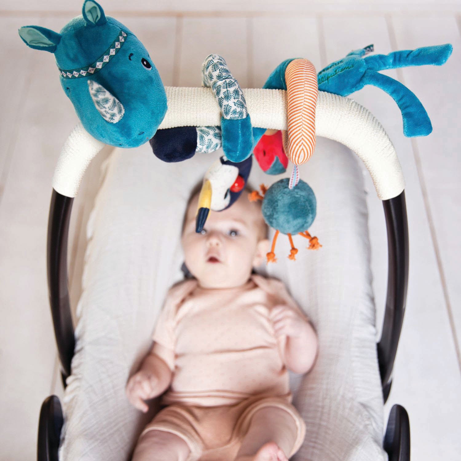 Marius the rhino offers a range of activities and surprising discoveries to delight baby wherever they sit. Wrap him around the pram handle, cot or play pen and let the attachments weave their magic. Grab hold of Marius's legs for that scrunchy sound the little kids love so much! The hanging embellishments include a toucan with a bell, a crab with a mirror and rattle and a cute piece of watermelon to inspire movement and play. So many activities to keep baby happy combined with fabric textures and prints ensure Marius Activity Spiral will be loved by baby and entertain for ages!