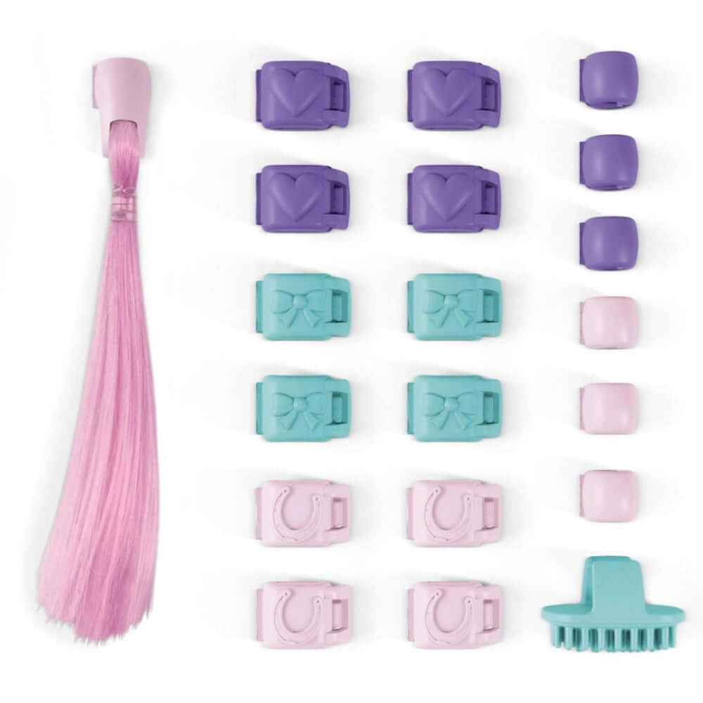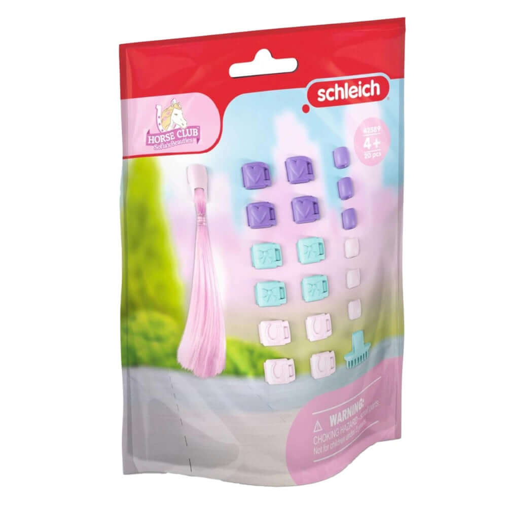 The Horse Hair Accessories from Schleich’s range of Sophia’s Beauties is the perfect way to accessorise your model horses. Dress up your Sophia’s Beauties model horses and their real, brushable mane and tail with the purple, pink and turquoise hair beads, clips, brush and extension to add a splash of glamour and colour to your riding adventures.